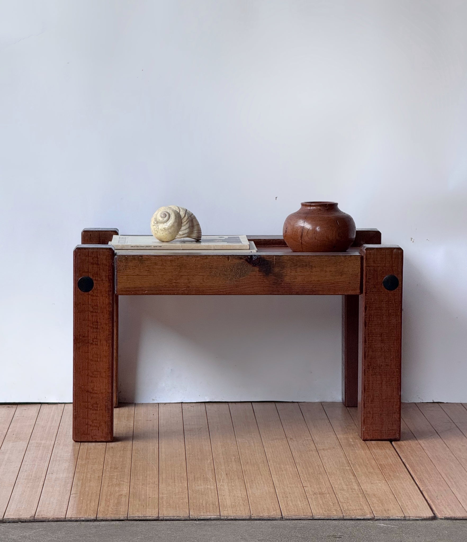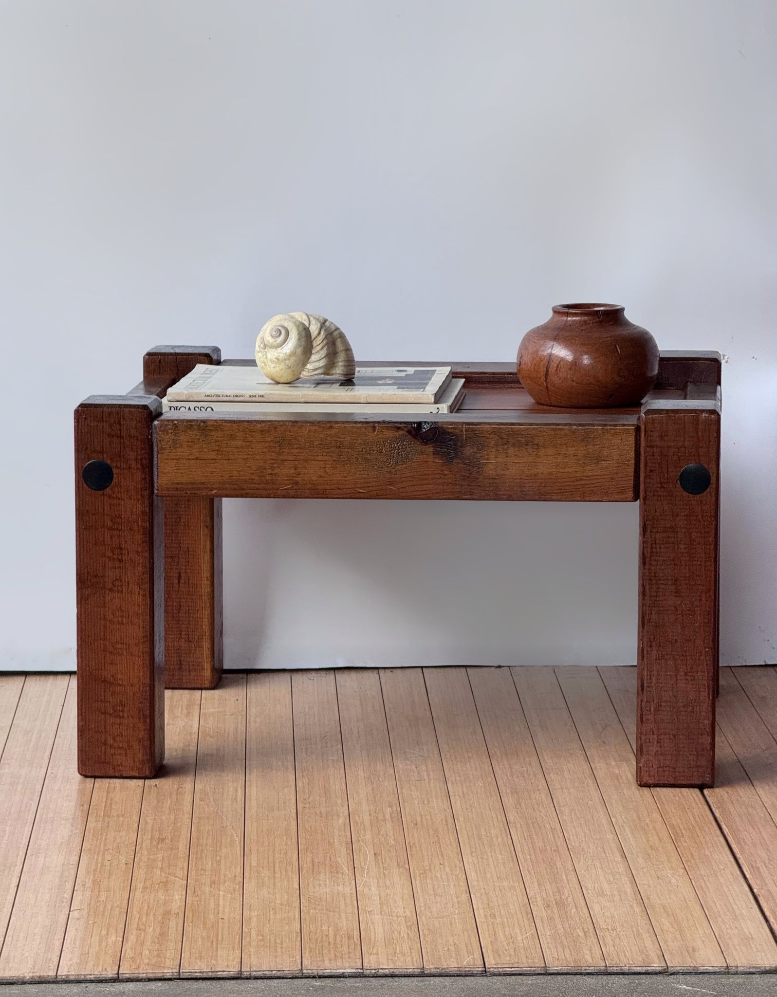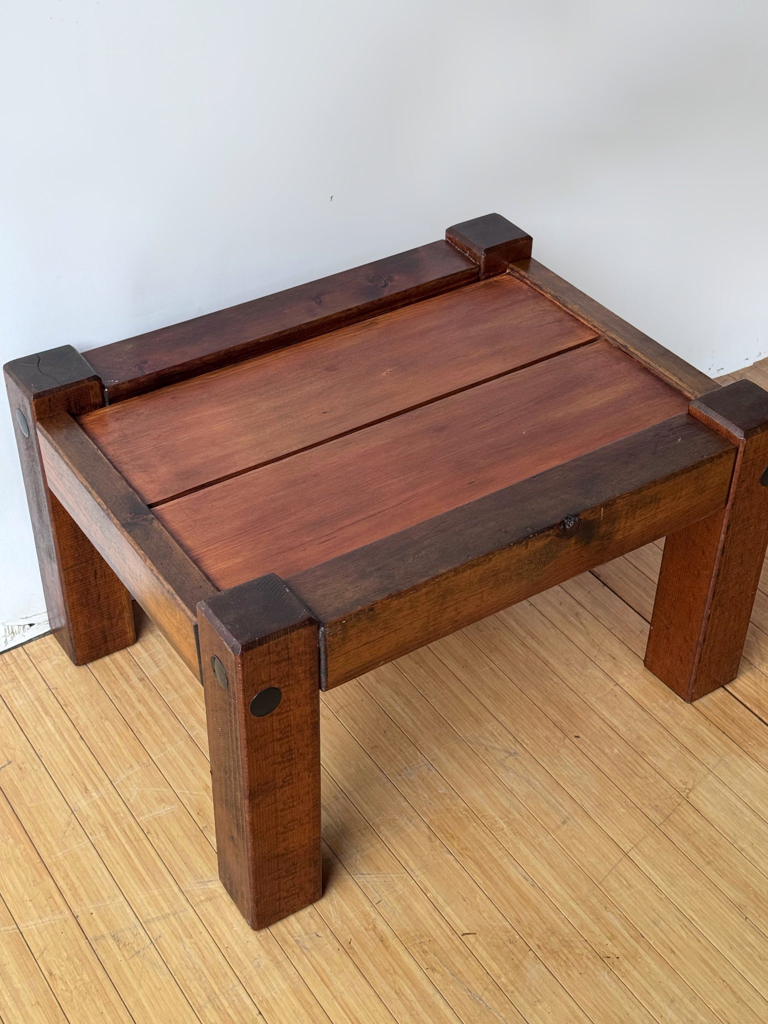 Small and chunky handcrafted wooden coffee table. Super cute and solid with a brutalist style. Dimensions: 15"T x 25"W x 20.25"D