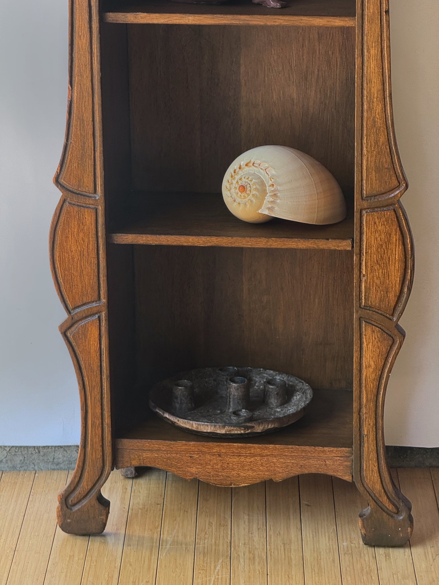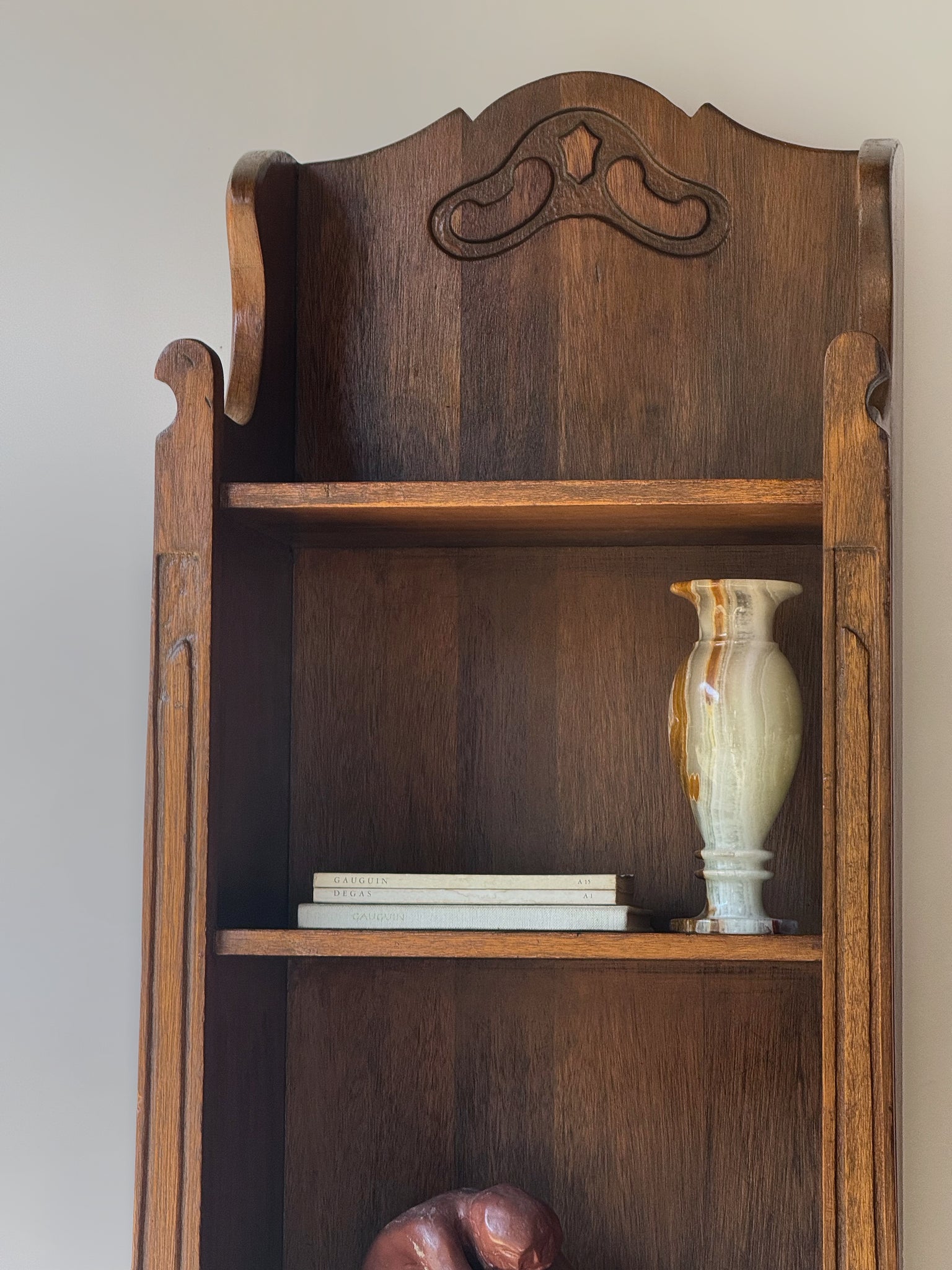 Unique Antique wooden shelving unit. Ornate carved wooden details on top and along the side edges. In overall great condition. Solid wood, sturdy and stable. Dimensions: 60.25"T x 16"W x 10.5"D