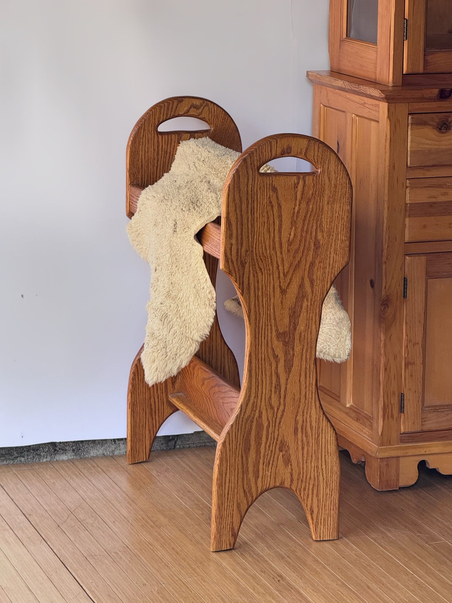 Vintage oak blanket stand. In perfect condition. Very unique and sculptural design. Sturdy and solid, looks super cute when blankets are draped over it. Dimensions. 34.5"T 27"W 10.5"D
