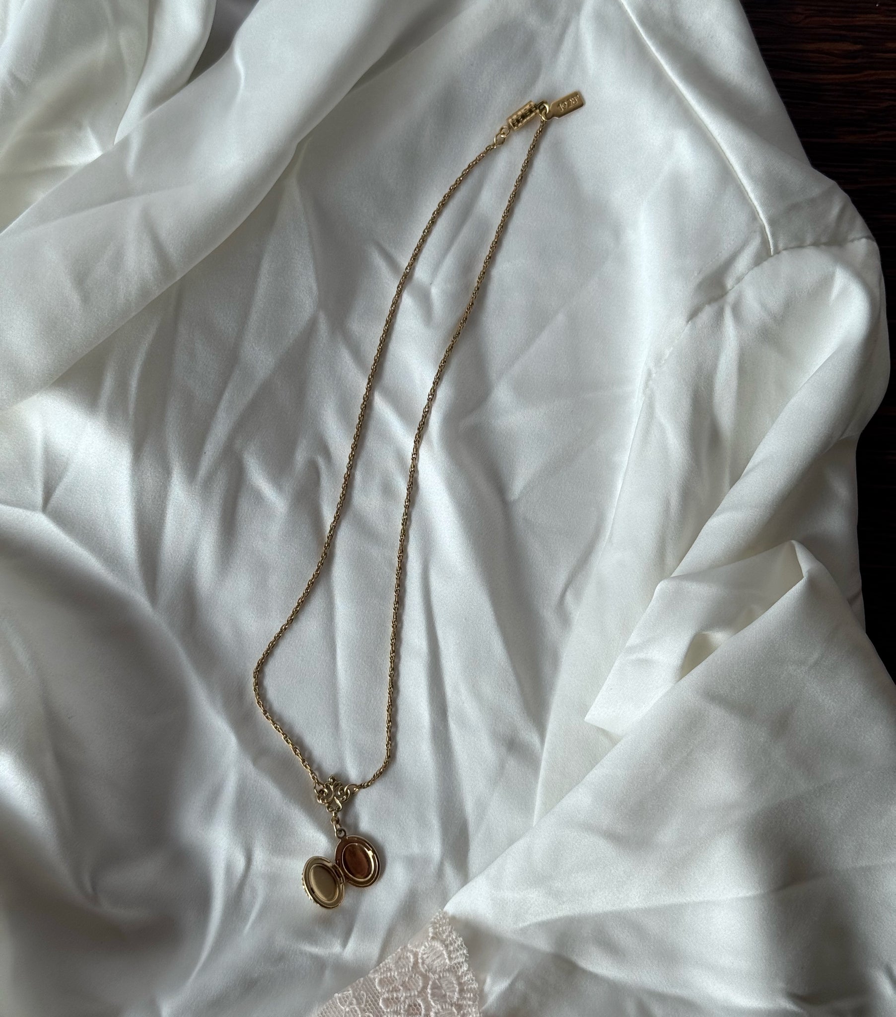 Small gold plated antique locket. Opens up to two spaces for photos. Super cute and in excellent condition. Please note this is a very small necklace and would most likely be best for size XS/S or a child. Measures 8.5"L