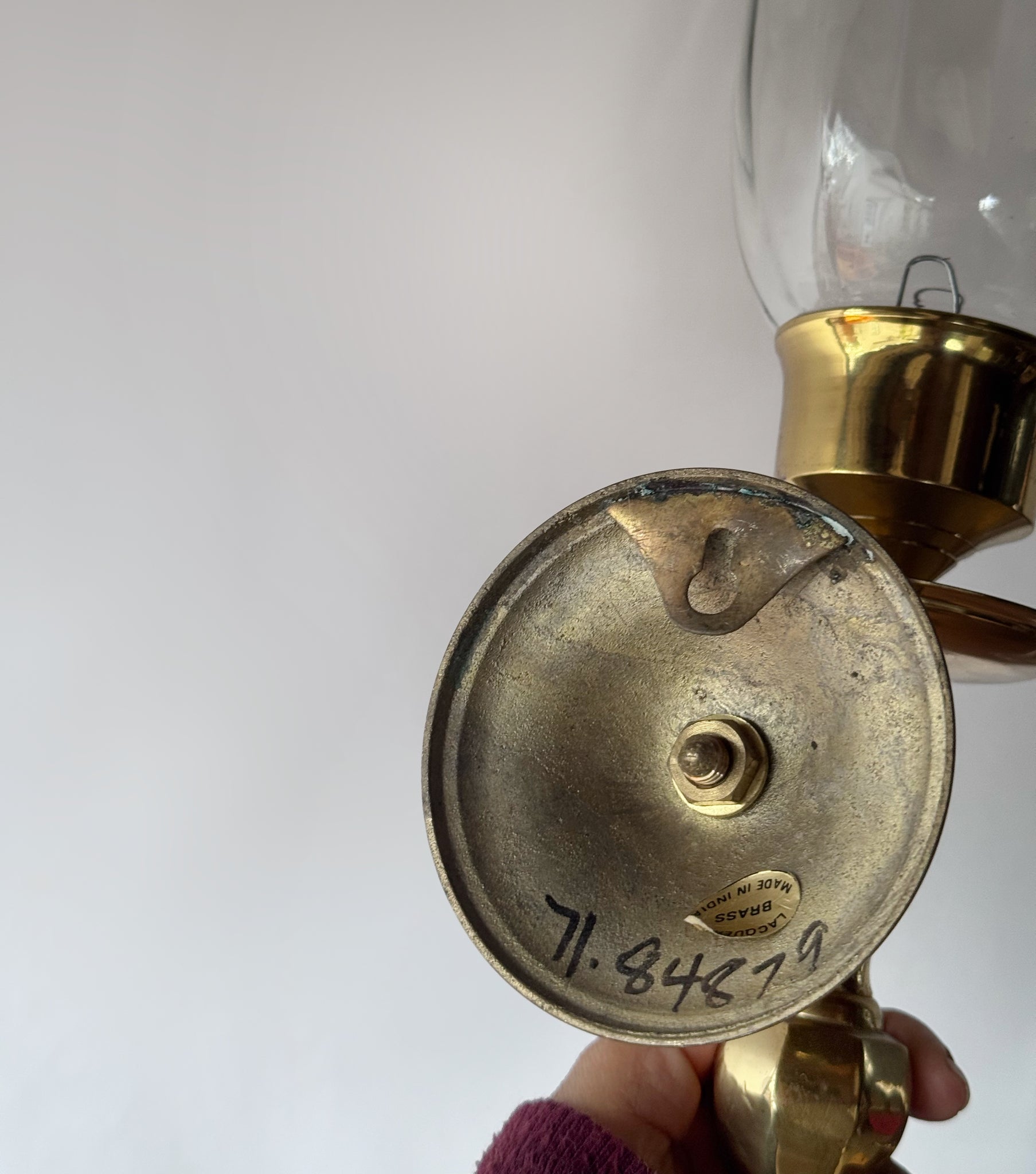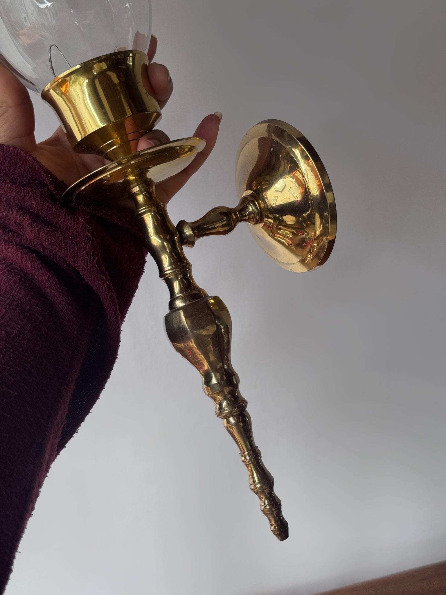 Elegant antique brass candlestick glass candle sconces. Large statement pieces that look gorgeous when lit up. Heavy and solid. In excellent condition. Measures 17.5" tall