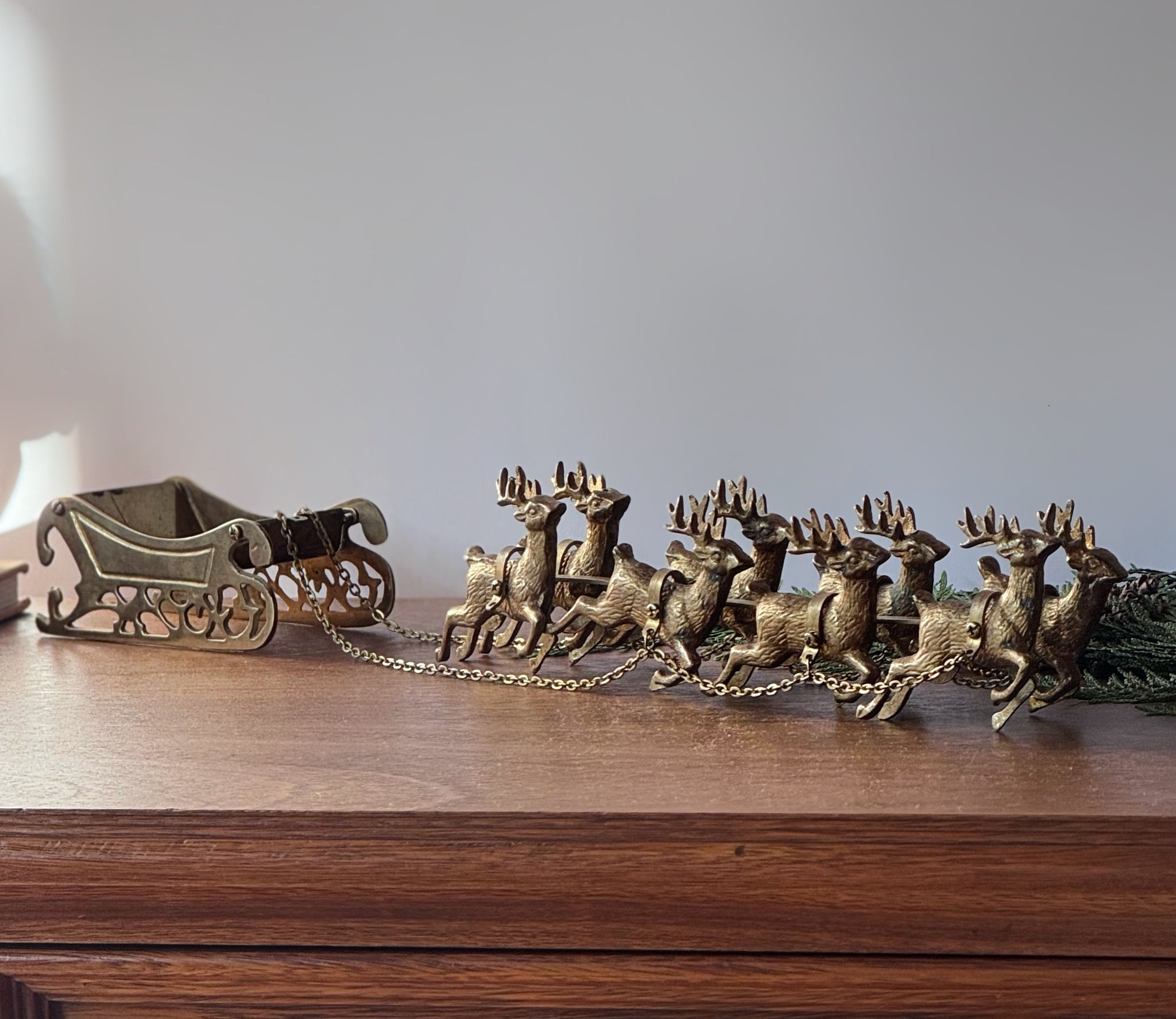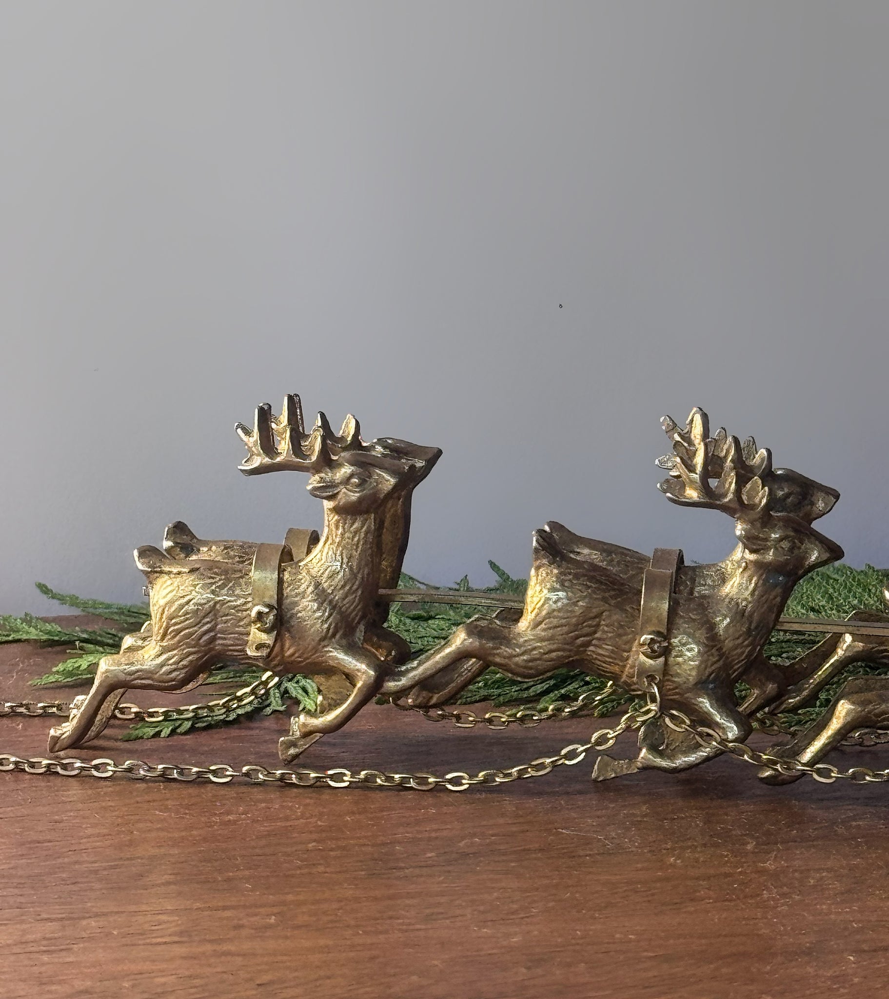 Gorgeous solid brass vintage sleigh and reindeer set. Make for the cutest Christmas decor. Natural patina consistent with age, can easily be polished off if desired. Please note the one missing chain link on one reindeer. Measures 17"L Reindeer-3"T Sleigh-2.5"T