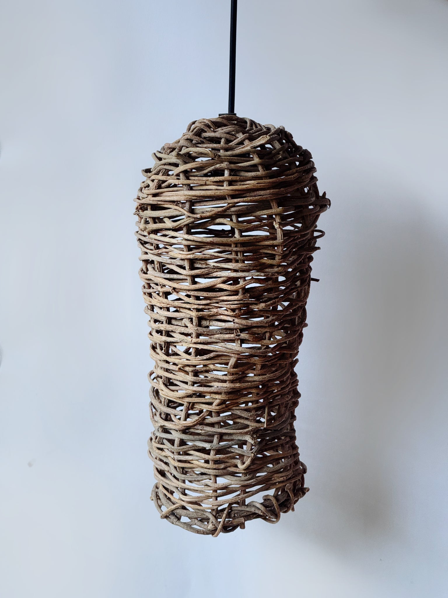 Handwoven basket lamp made from foraged sticks, in excellent condition. Looks super cute when hung and lit up. Measures 15"T Circumference-7"