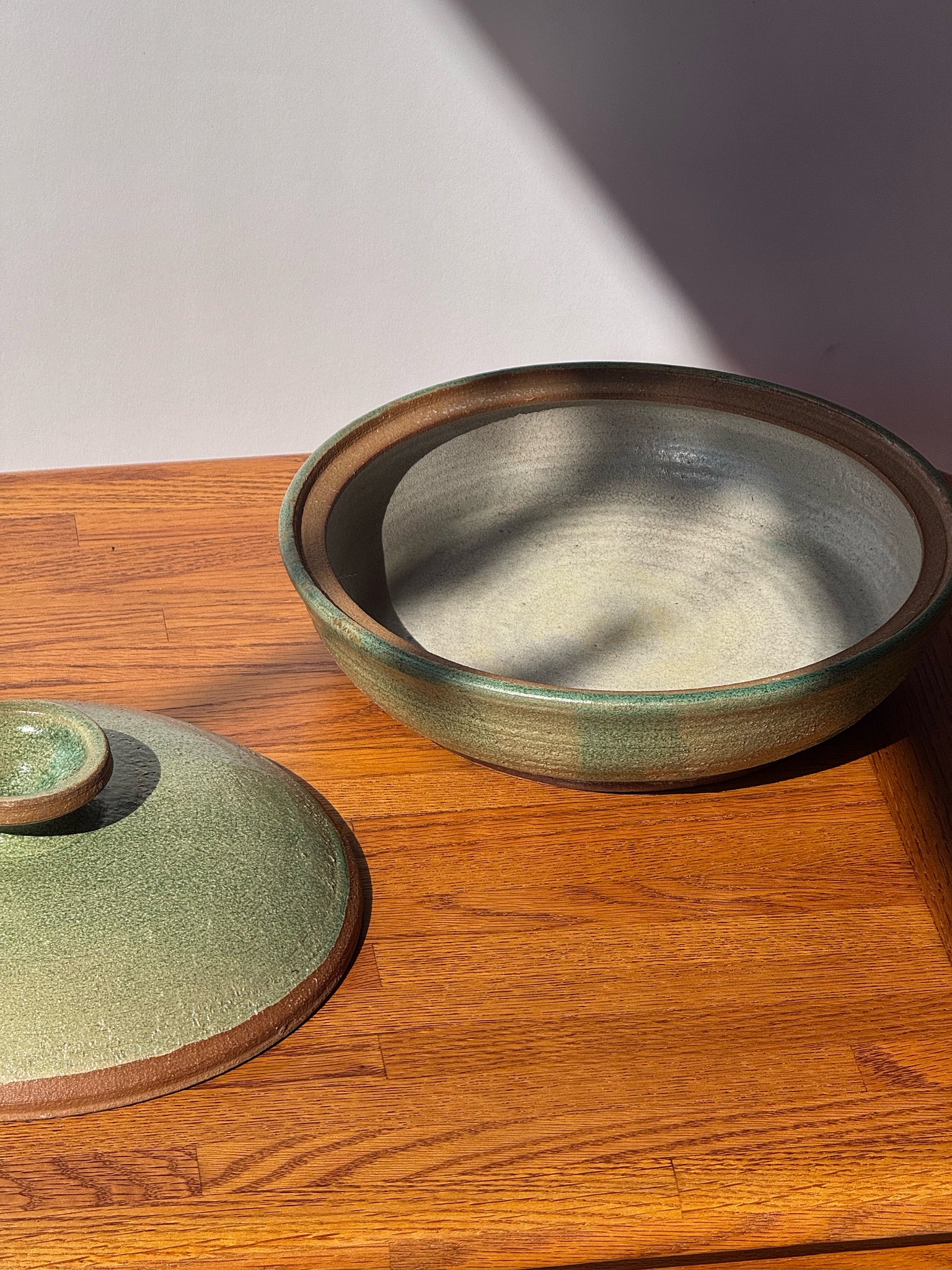 Gorgeous stoneware lidded dish, signed by the artist "LA" on the bottom. In excellent condition without any cracks or chips. In a beautiful sea green and terracotta color. Measures 10" x 5.5"