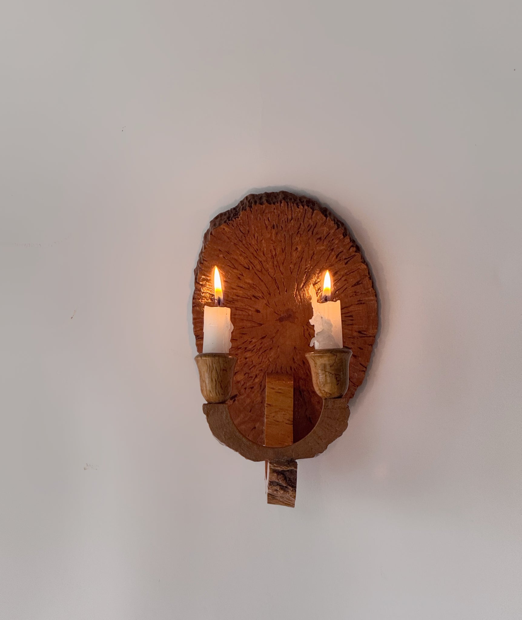 Amazing handcrafted wall candle sconce made from live edge wood. Has an earthy primitive feel, looks gorgeous when lit. Measures 9"T x 5.25"W x 4.5"D