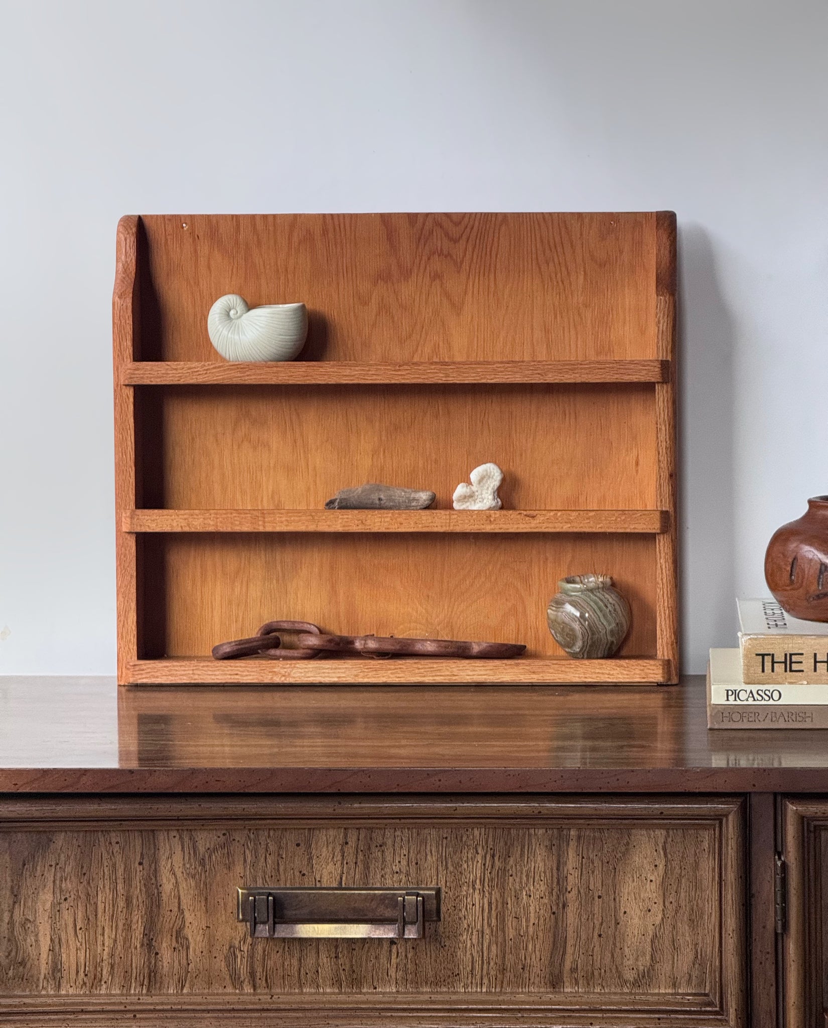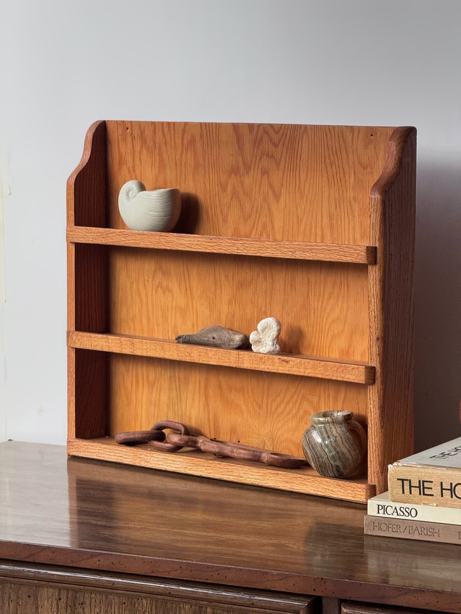 Handcrafted wooden hanging shelf in a golden oak color. Two holes drilled up top for hanging or works great as a counter top piece as well. Super cute. Measures 16.5"T x x 20"W 3"D