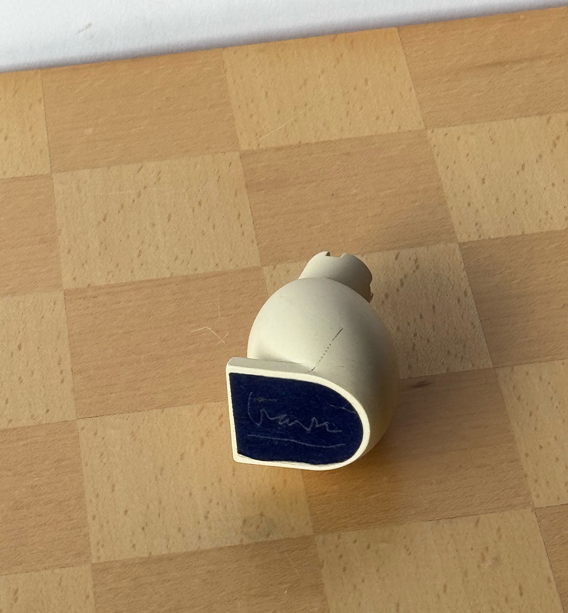 Designed by the renowned American architect Michael Graves, known for his postmodern style. Pieces are made of heavy resin in ebony and ivory tones. Set is housed in a maplewood box that doubles as a game board The design of the pieces is based on the egg shape, which Graves considered a perfect form in nature.Please note the 4 missing pieces (reflected in the cost)Dimensions: 18" x 18"