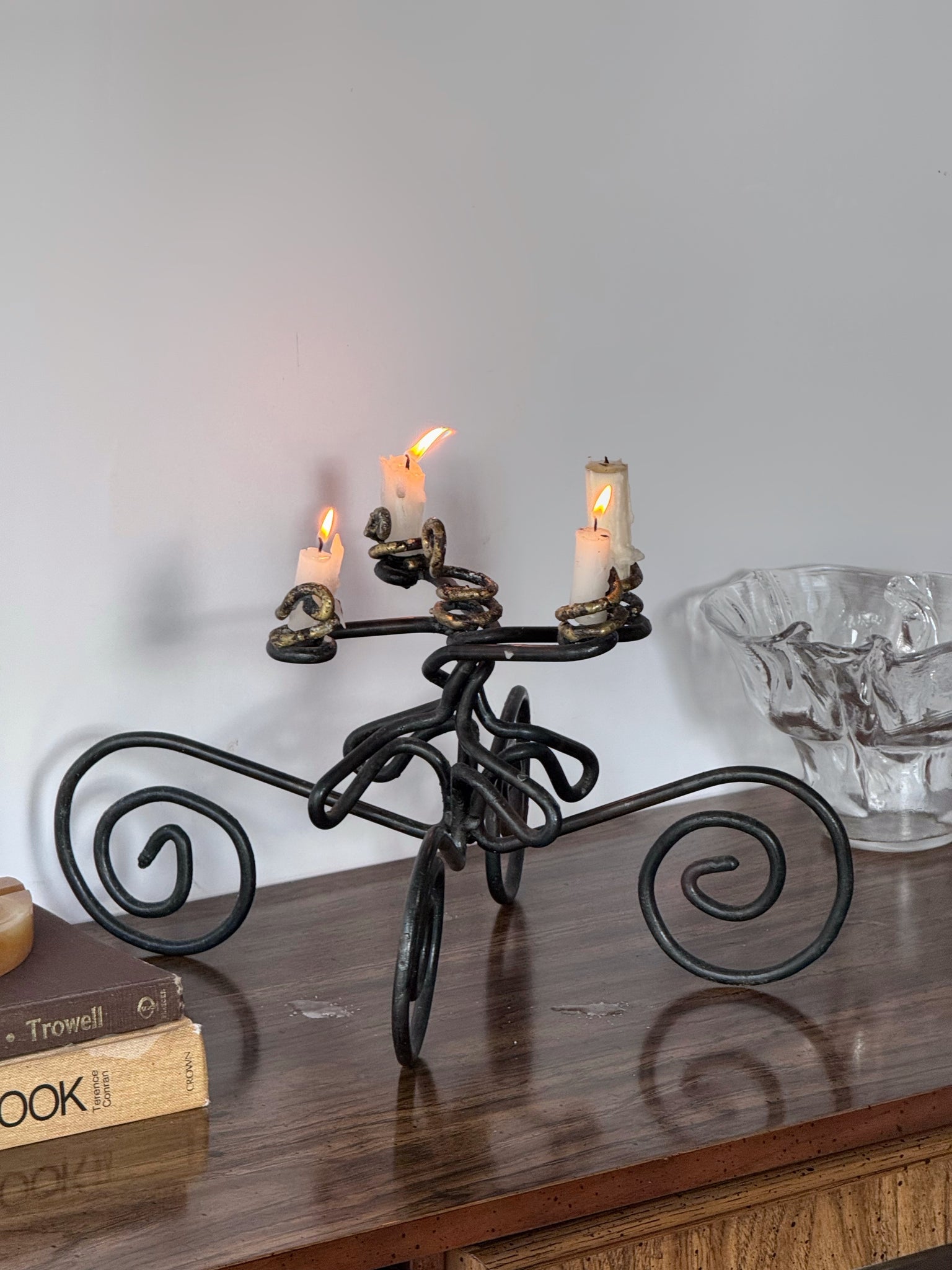 Amazing large statement iron spiral candelabra. In great condition with some wear to be expected with age. The top of the candle holders has a gold residue on it that could be from a previous candle. This doesn't come off. Holds 5 candles. Measures 10"T x 12"W x 11"D