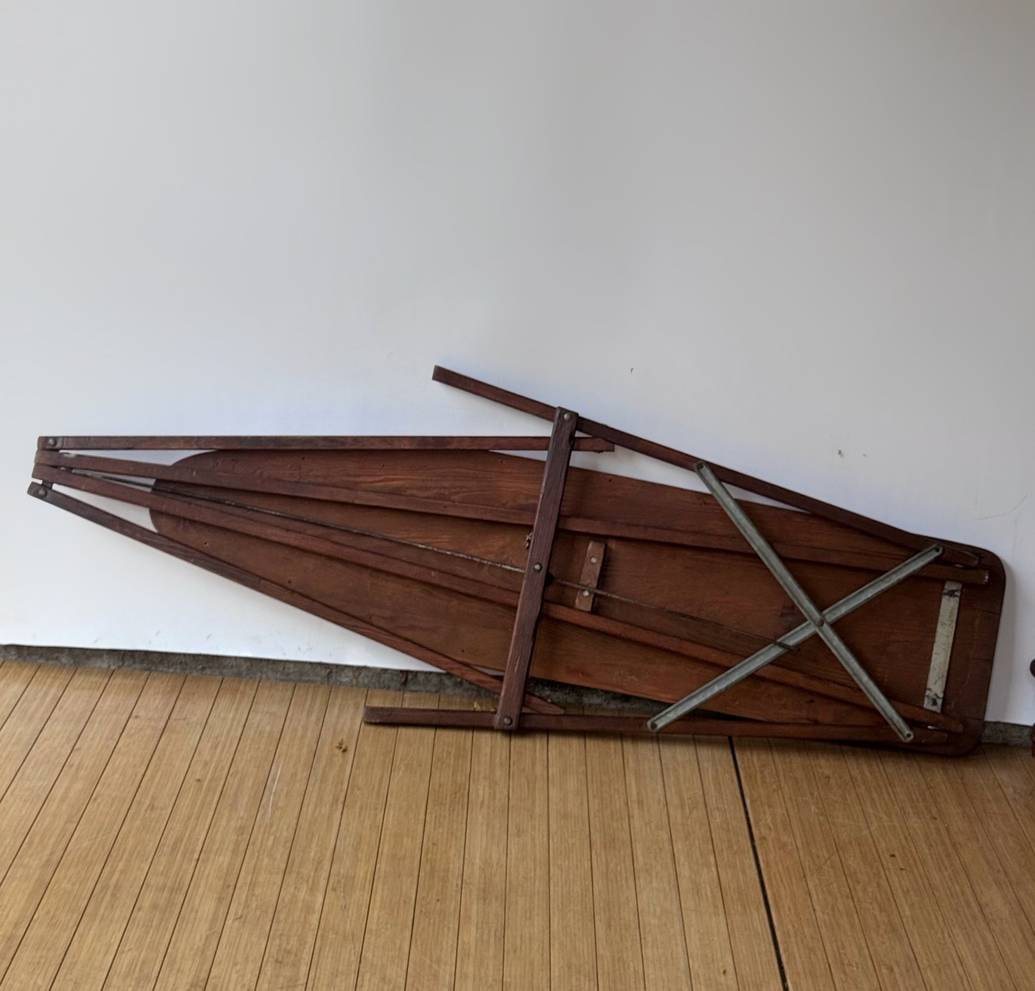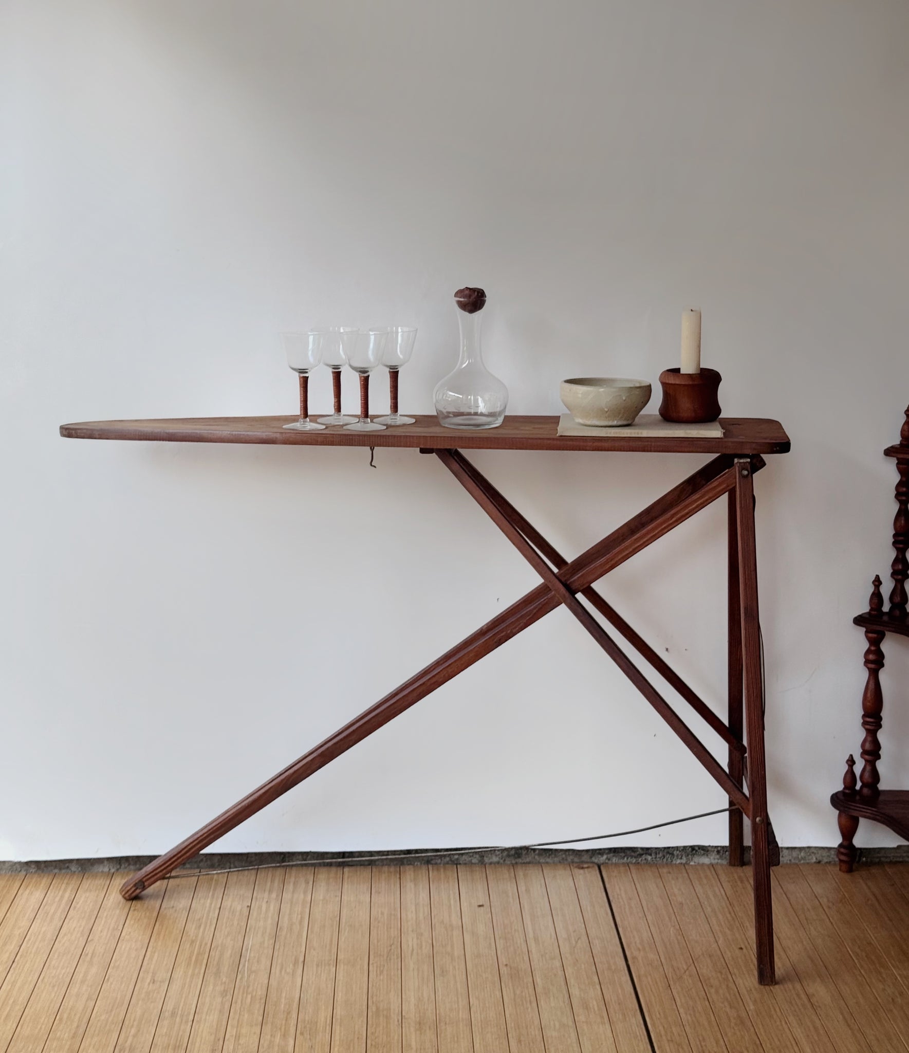Super cute primitive antique wooden ironing board. Folds in and collapses for easy storage and transportation. Once set up, board is stable and sturdy. Gorgeous antique wood. Dimensions: 32.5"T x 47"W x 13.5"D