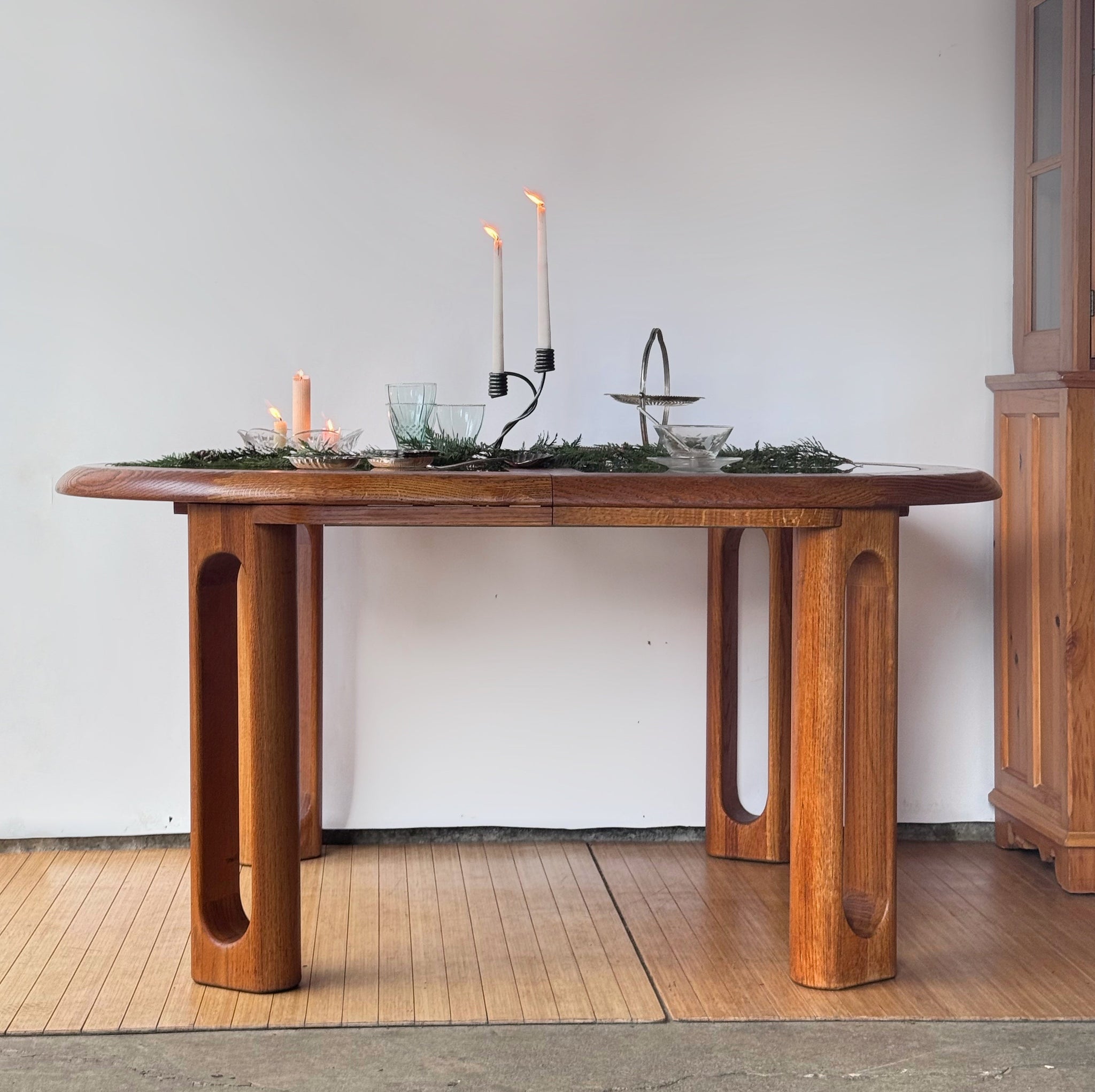Gorgeous oak sculptural dining table. Smokey glass top with one single oak leaf insert that expands the table to 80" long. In excellent condition. Solid and heavy with unique teak + oak legs. Dimensions: 62"L (without leaf) x 29.5 T x 43"W. With extending leaf-80"L