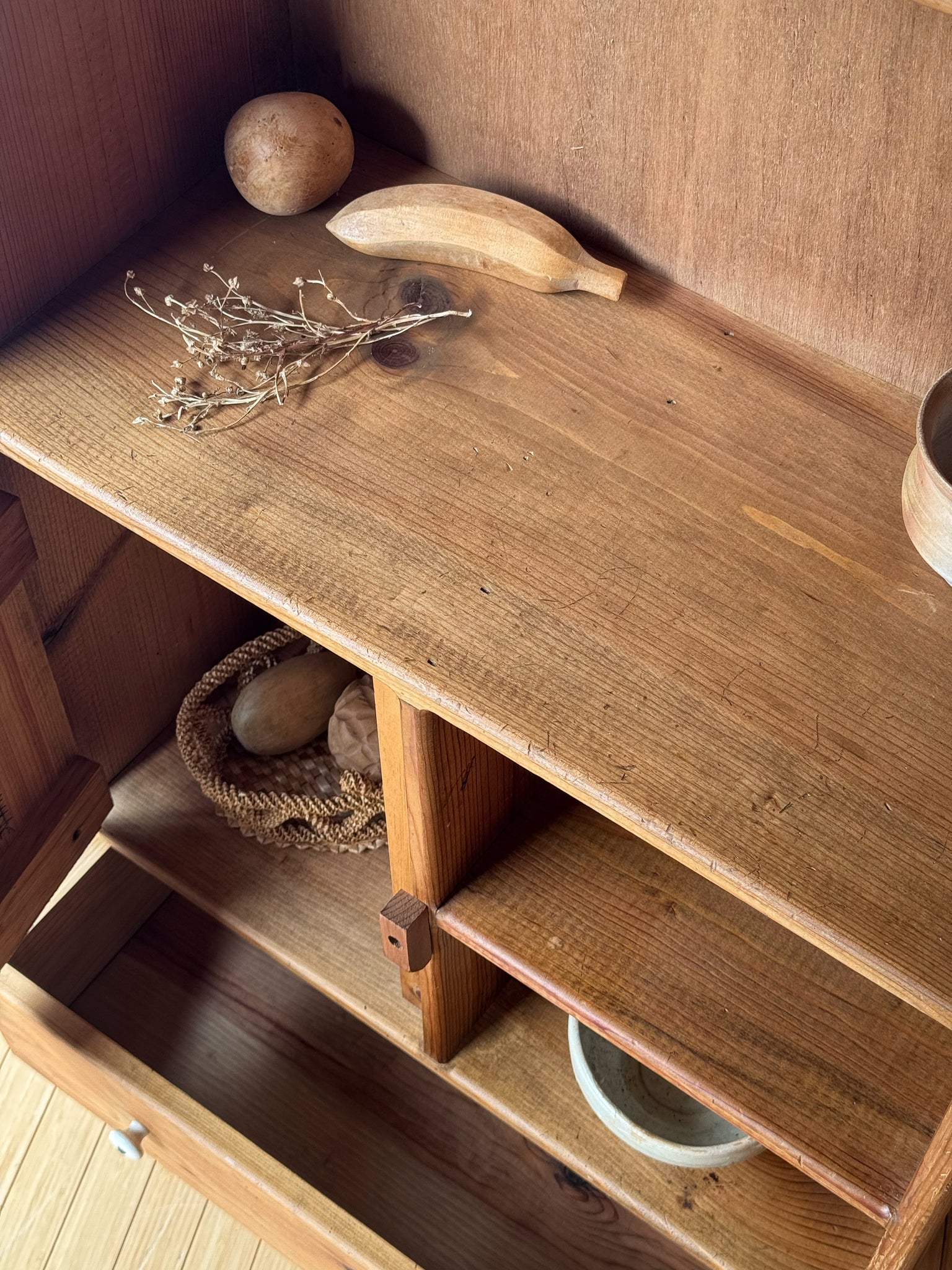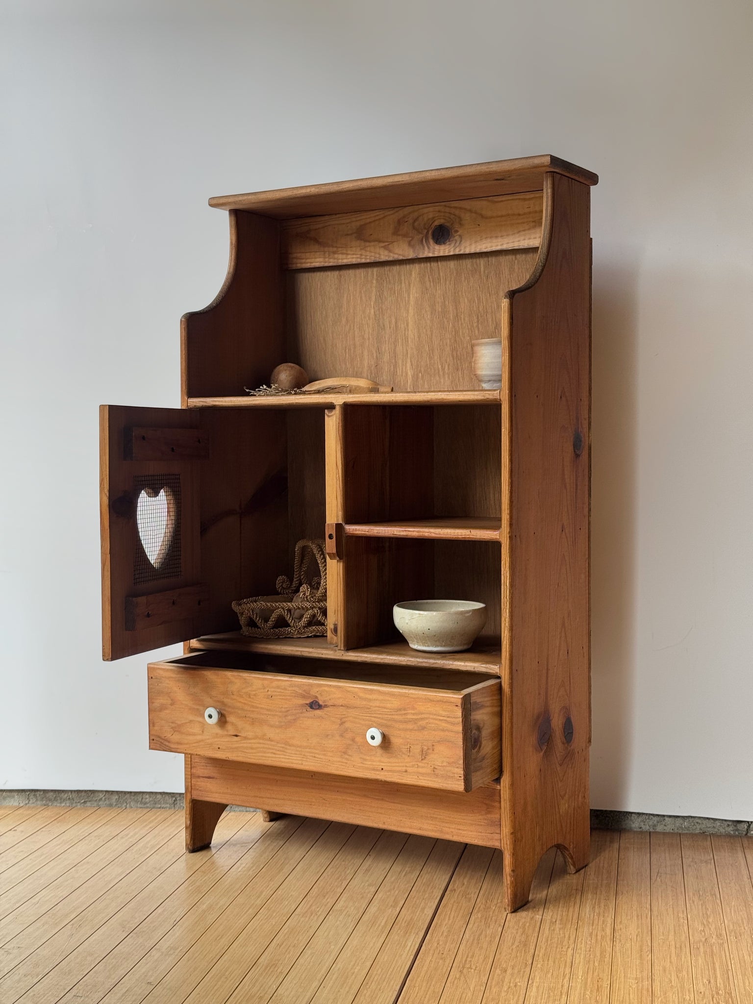 Adorable handcrafted children's hutch, perfect for a nursery or little girls room. Drawers and door all function properly. Normal distressed aesthetic with a super cute heart shaped cut out. Perfect for imaginative play. Dimensions: 43.25"T x 25"W x 11.25"D