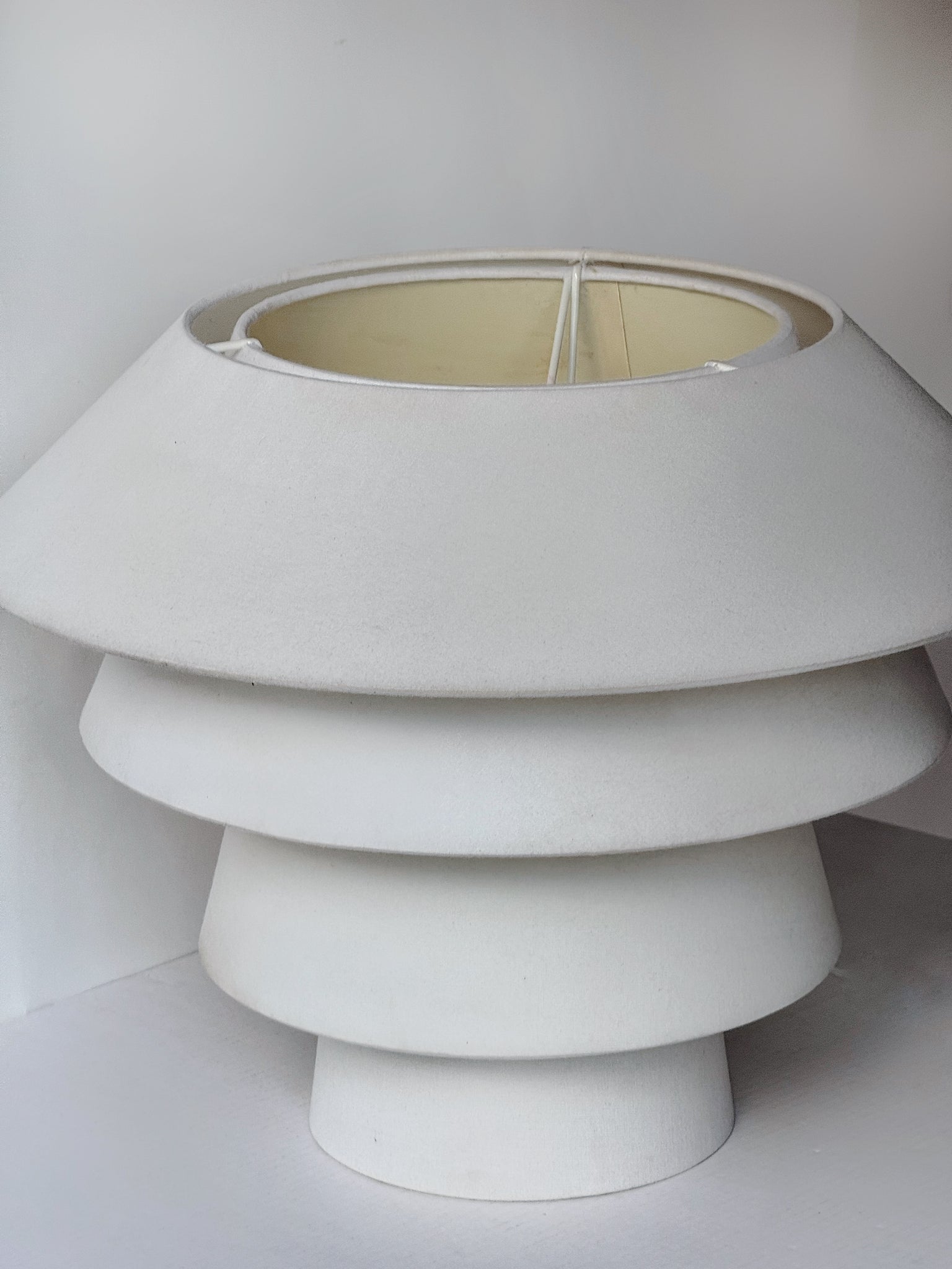 Scandinavian white multi-shaded pendant lamp from the 1970s, in the style of Alvar Aalto or Ilmari Tapiovaara. Also similar to the "Visiere" table lamp by Sergio Asti for Martinelli Luce. In great condition with the exception of very faint spotting. This is hardly noticeable but is reflected in the price. See last photo. Note the Dimensions: 16"T x 20" Diameter.