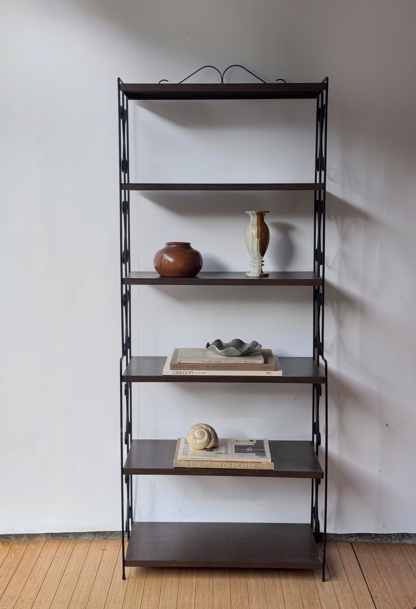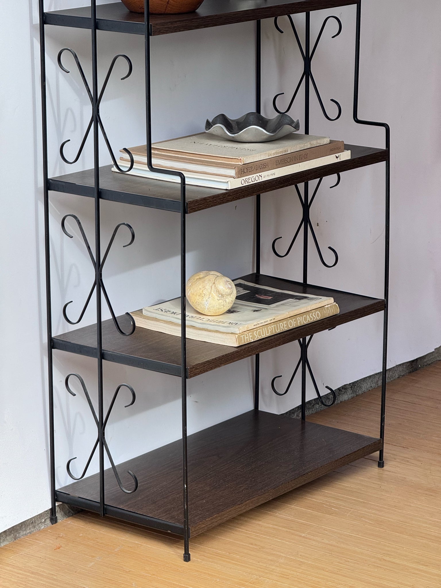 Very cool retro metal MCM shelf. In perfect condition. Great to use as shelving for plants. Lightweight with a faux wood print on the metal shelves. Dimensions: 60.75"T x 25.75"W x 9.25"D