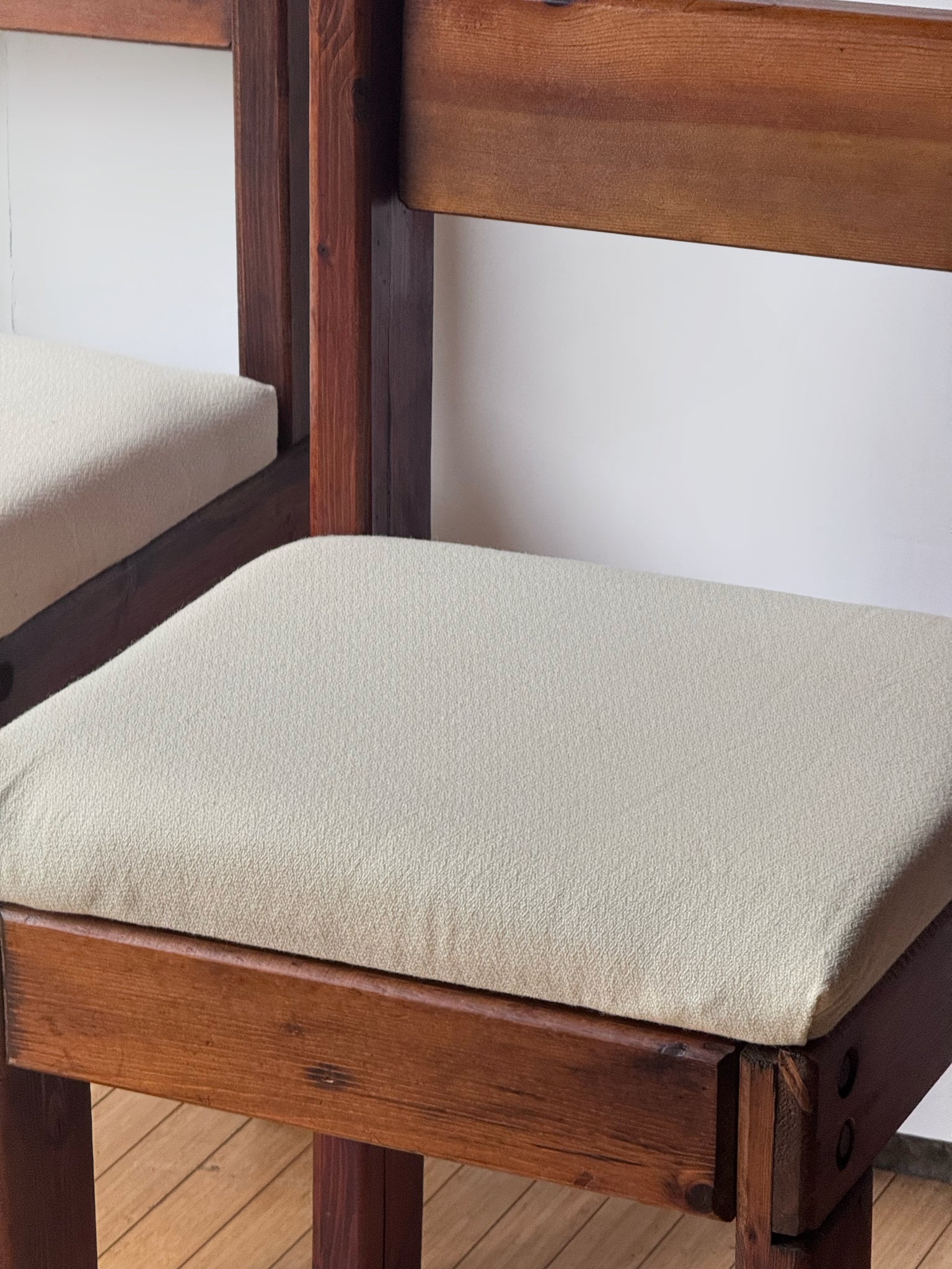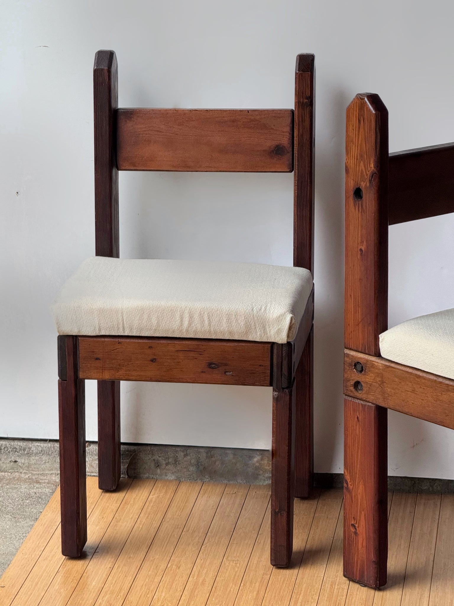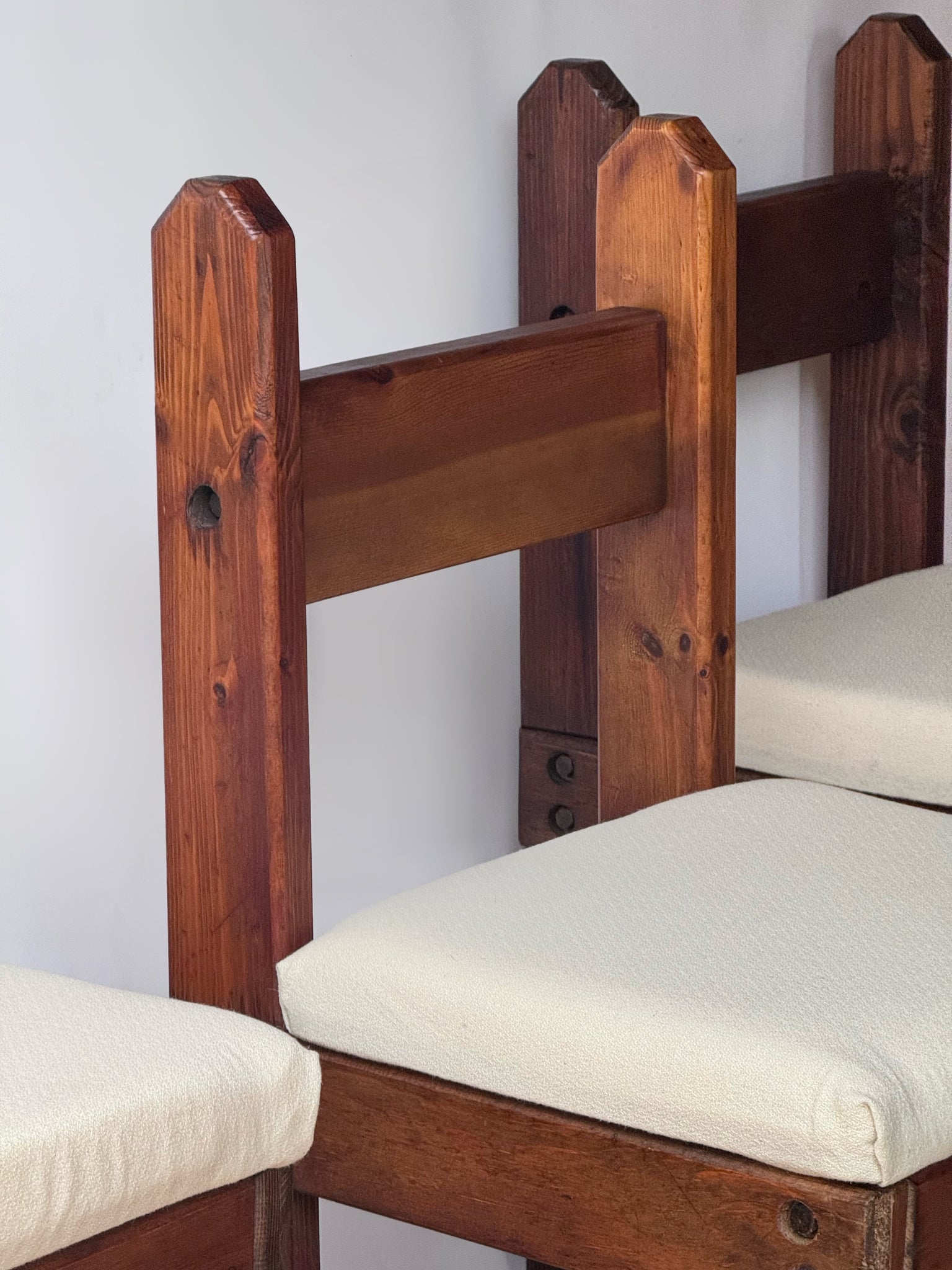 Set of 4 vintage chunky wooden dining chairs. Bold primitive and brutalist design made from solid pine. Seats are recovered with an off white 100% Pendleton wool upholstery. Solid, heavy statement pieces. All are in excellent condition. Dimensions: 36"T x 18"W x 19"D Seat Depth-15.5" Seat to Floor-20"