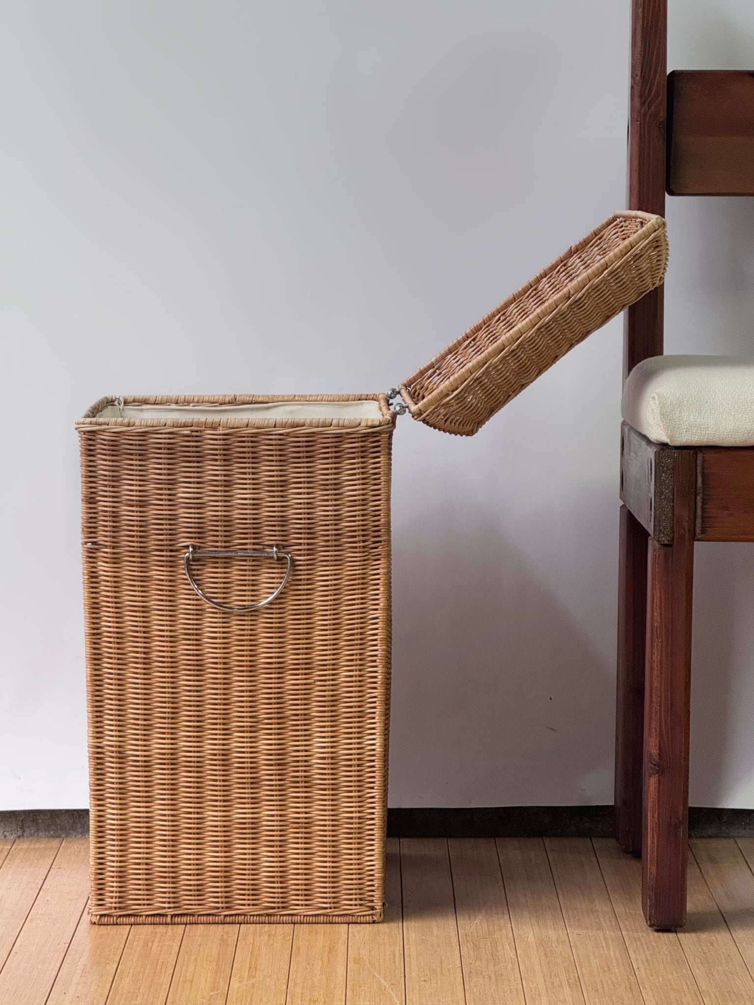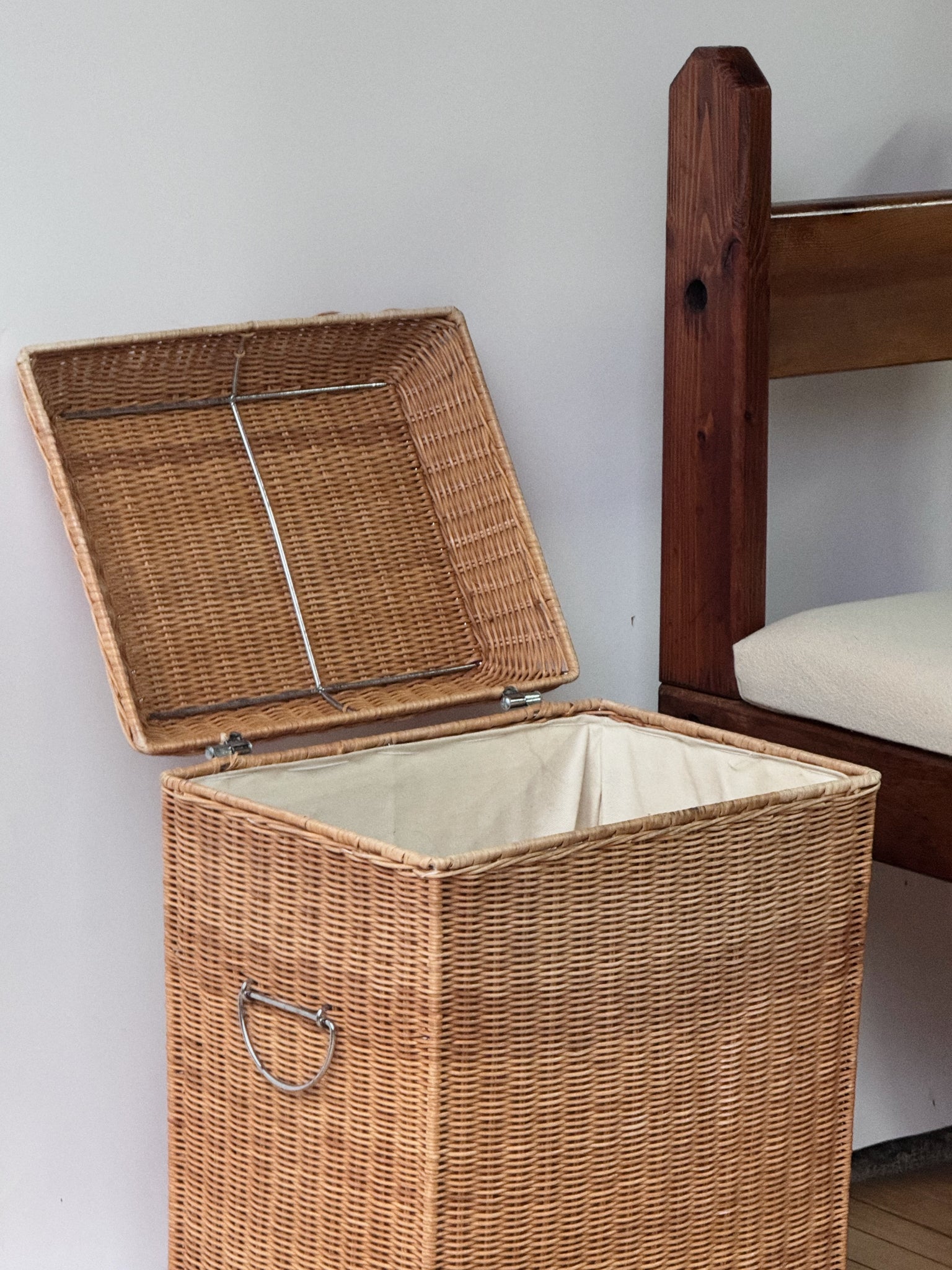 Very cute modern wicker hamper. Clean with minor wear consistent with age and use. Wicker is in tact with silver handles on the side. Super cute! Dimensions: 21.5"T x 15"W x 11.5"D