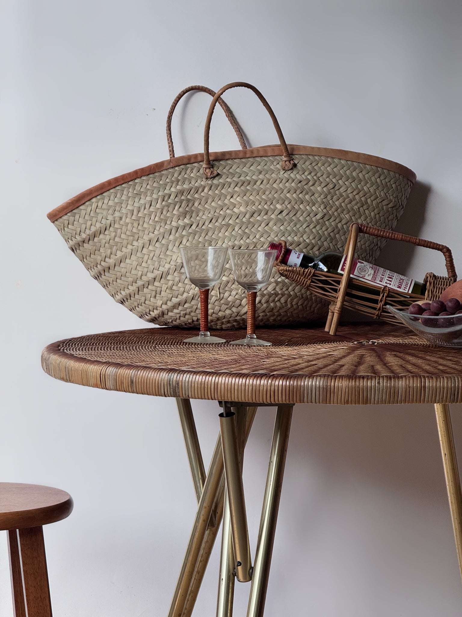 Rare round woven rattan table on collapsible metal legs. Super cute and in great condition. Table top is made from an easy to clean material and designed to resemble a woven rattan look. Legs collapse for easy transportation or storage. Perfect for a sun room Dimensions: 27"T X 42" Circumference